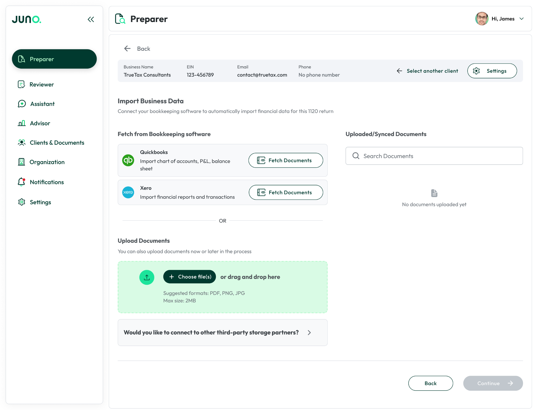 Juno connects to QuickBooks or Xero at the firm level. When you start a business return, Juno pulls the P&L and balance sheet directly for that client. No exporting. No re-keying.